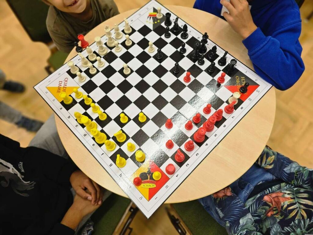 Zur Premiere unseres Schach- und Spieletreffs trafen sich 25 Kinder und elf Erwachsene im Katholischen Gemeindehaus. Sofort nutzten alle die aufgebauten Schachbretter und Spiele, um mit Begeisterung zu starten. Besonders wurde über unser Quadro Schach gestaunt. Hier können sich vier Spieler in Zweierteams oder im Modus „jeder gegen jeden“ miteinander messen. In regelmäßigen Abständen schallte ein „Schach Matt“ durch den Raum, welches von dem Gegenüber sportlich akzeptiert wurde.